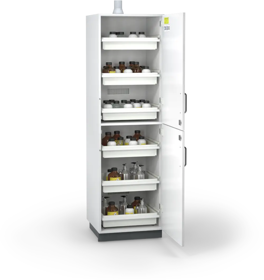 ACID line safety storage cabinets are optimised specifically for the storage of acids and lye. The varied additional functionalities of the cabinets of the ACID line increase workplace safety and comfort.