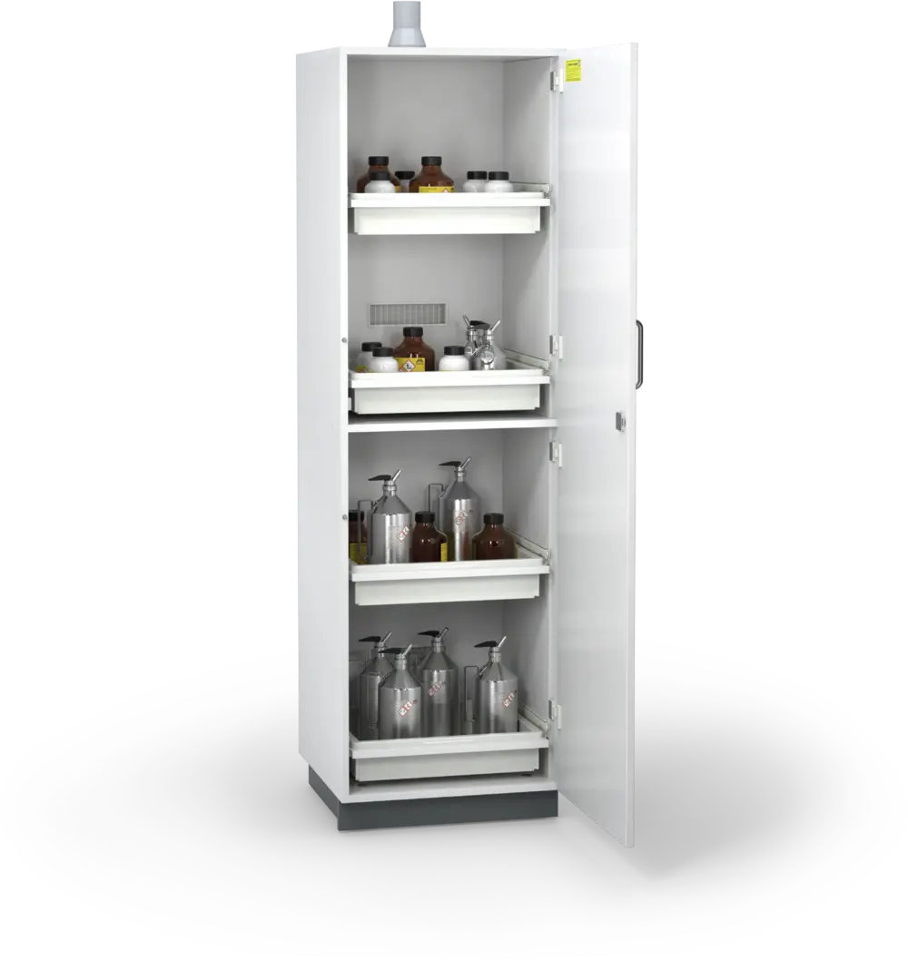 ACID line safety storage cabinets are optimised specifically for the storage of acids and lye. The varied additional functionalities of the cabinets of the ACID line increase workplace safety and comfort.
