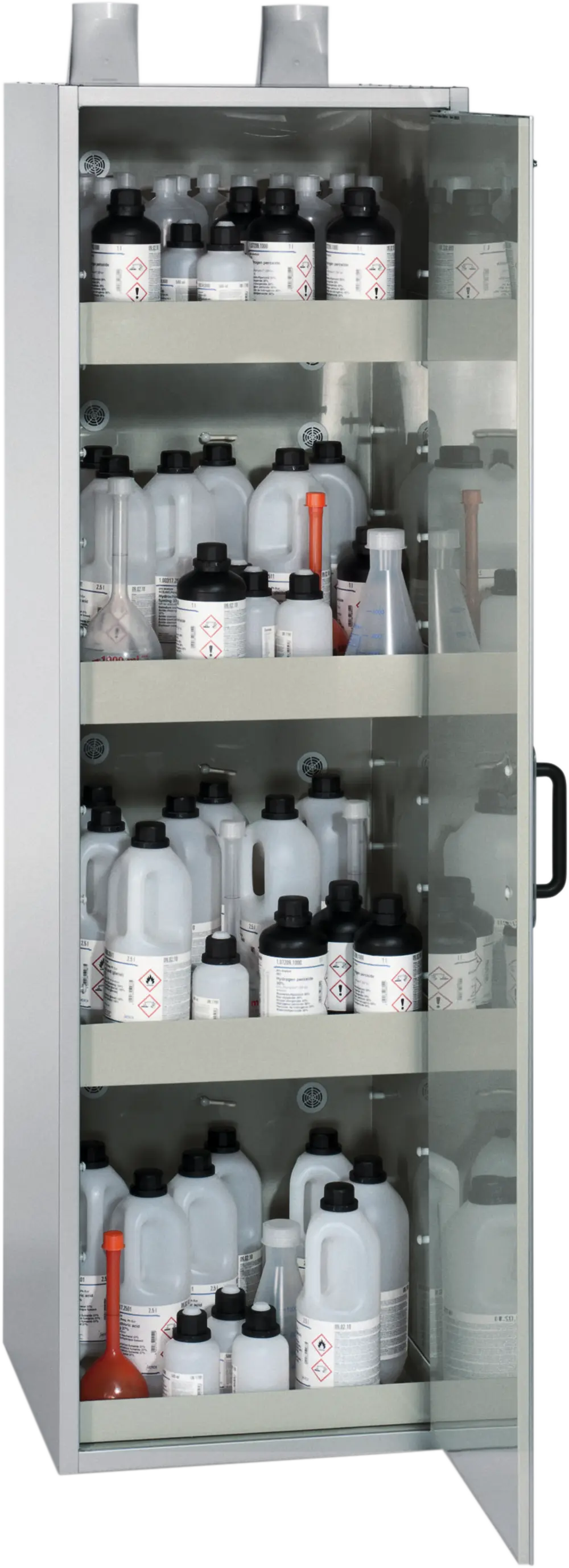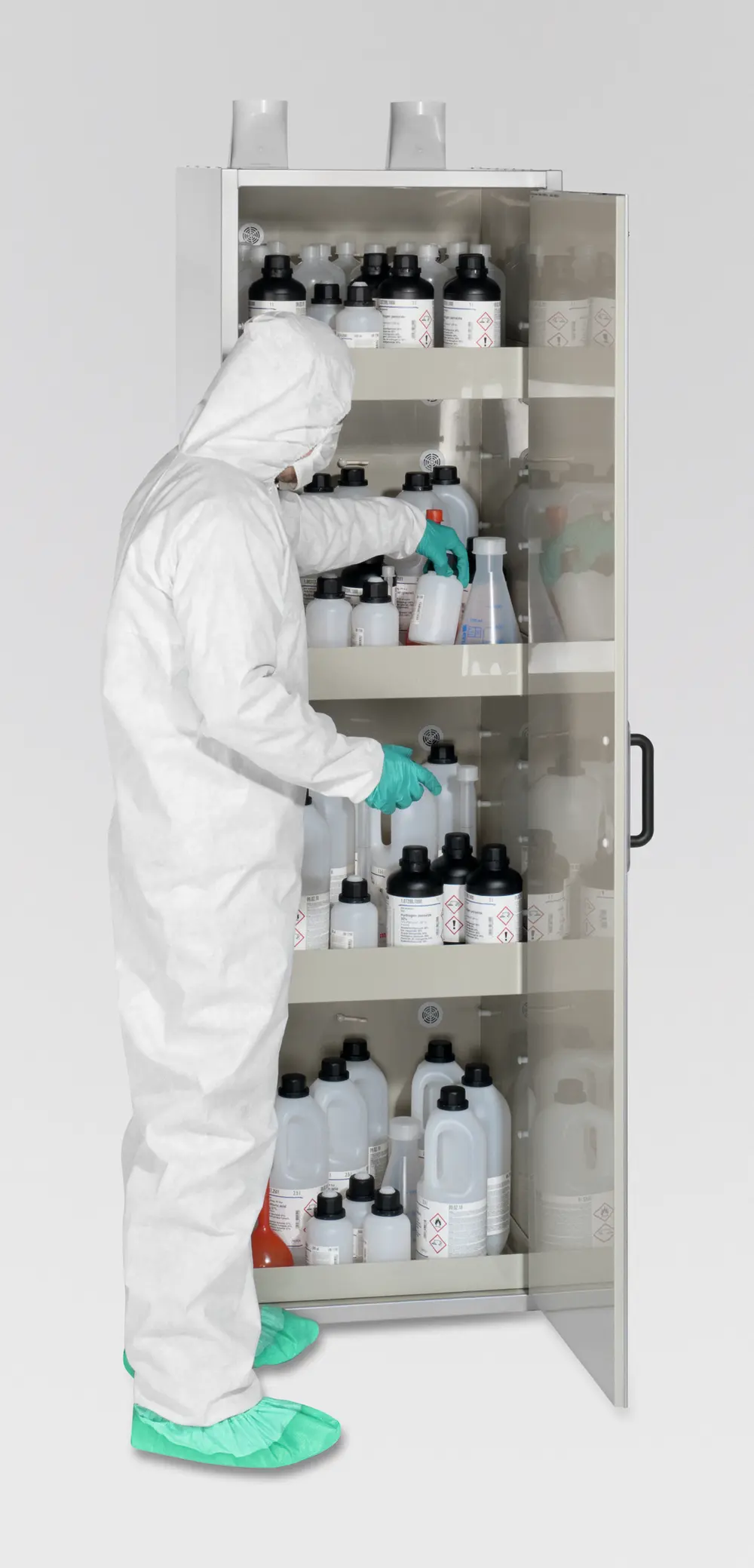 ACID line pure safety storage cabinets are optimised specifically for the storage of acids and lye in clean rooms. The varied additional functionalities of the cabinets of the ACID line pure increase workplace safety and comfort.