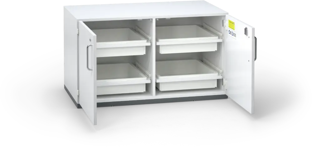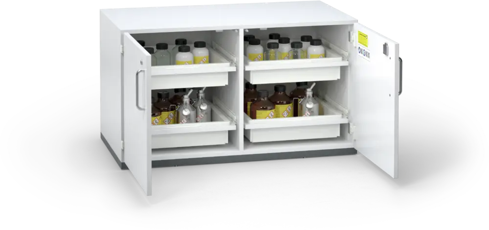 ACID line safety storage cabinets are optimised specifically for the storage of acids and lye. The varied additional functionalities of the cabinets of the ACID line increase workplace safety and comfort.