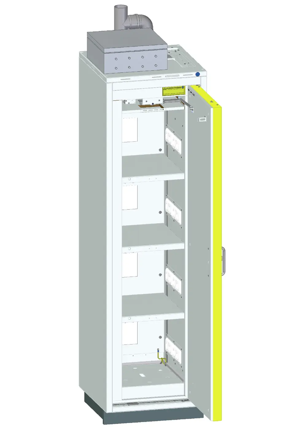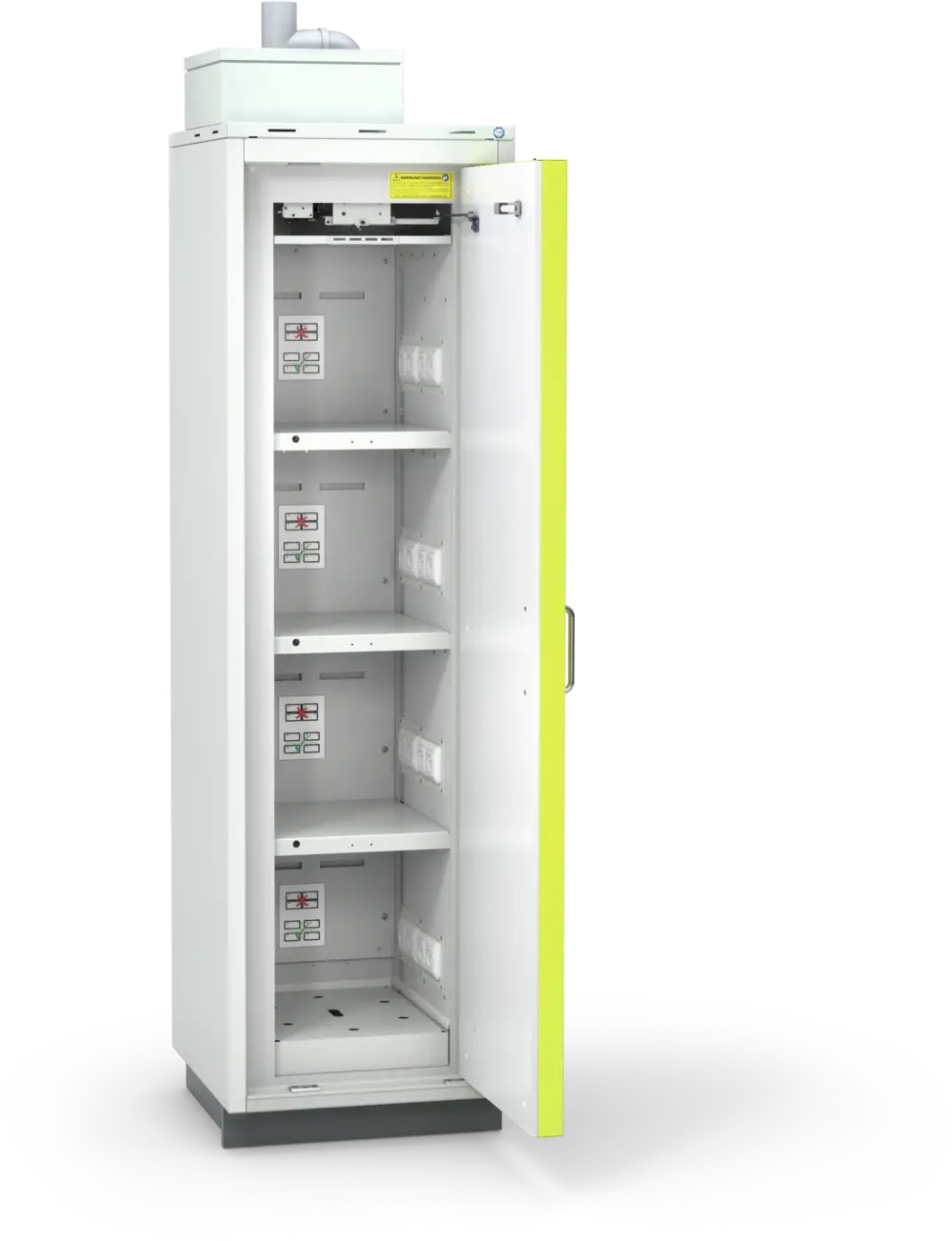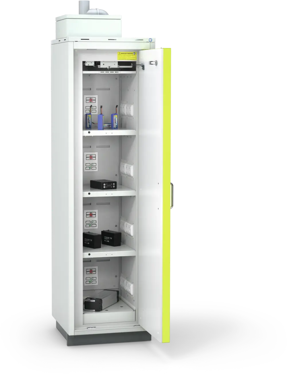 In the event of a fire inside the cabinet, the doors are automatically closed and locked to prevent a backdrafts (smoke gas explosion). - Safe charging