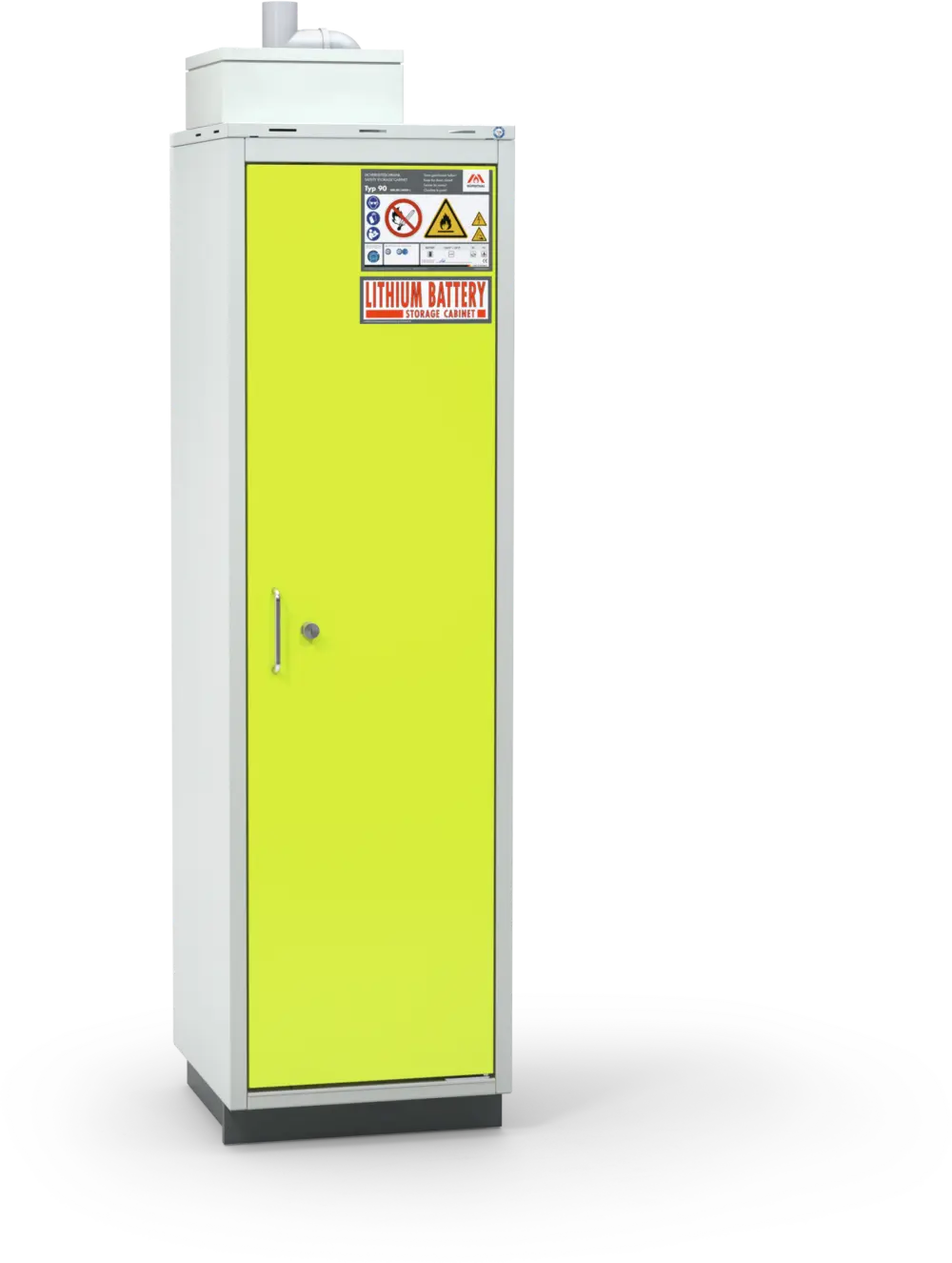 The BATTERY line safety storage cabinets are specially designed for safe storage and charging of lithium-ion batteries. With its Type 90 classification and explosive burning of batteries in the interior tested by the independent Fraunhofer Institute, the BATTERY line provides double fire protection. all safety-related components are not subjected to day-to-day dynamic loads and are thus free of attrition and mechanical wear.