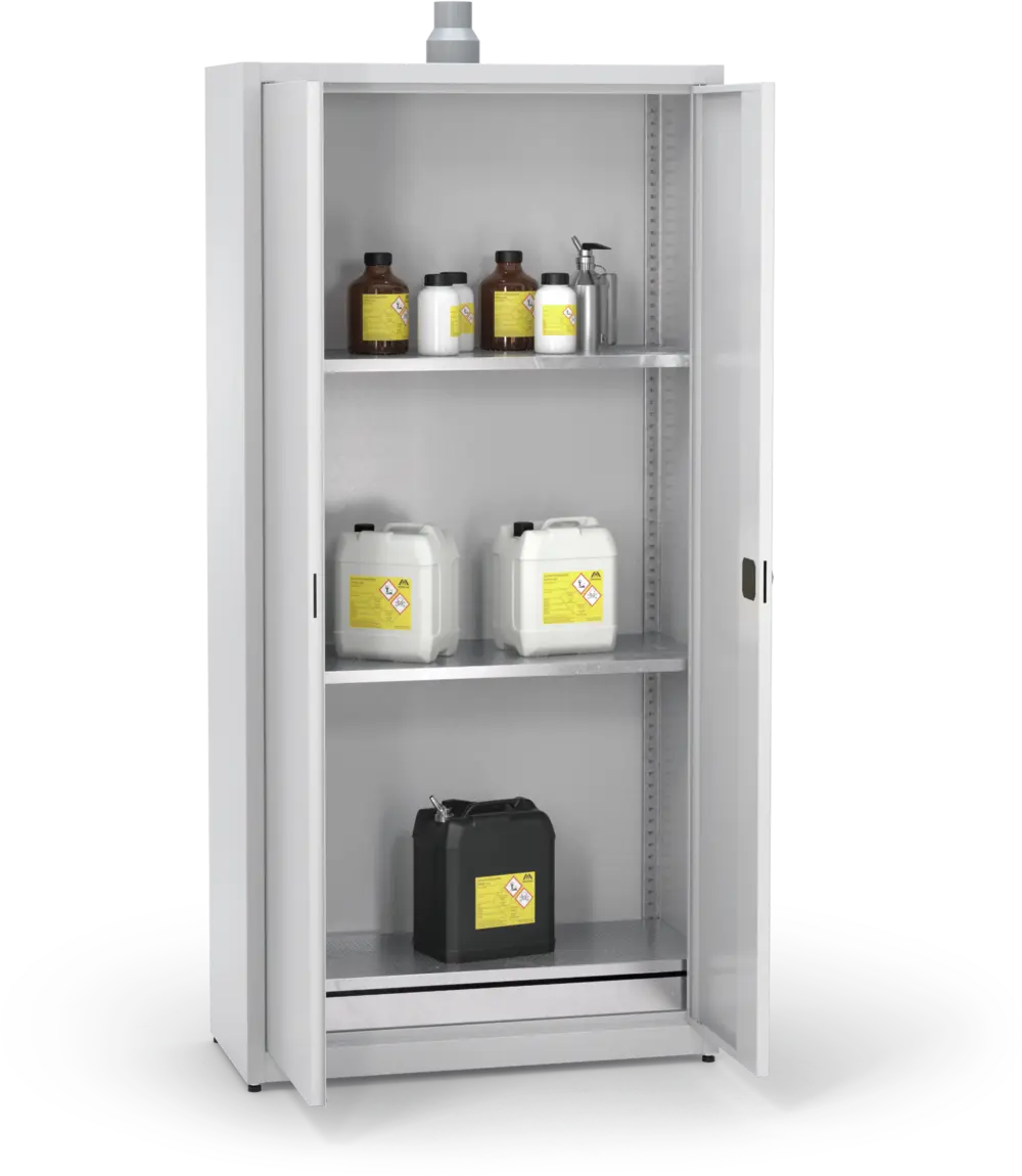 The CHEM tox models are suitable for the safe storage of solid, liquid, non-flammable and non-corrosive substances hazardous to water WGK 1-3 in small containers in accordance with regulations. This product is approved for the storage of max. 200 kg (440.92 lbs) of toxic substances class T, max. 50 kg (110.23) of highly toxic substances T+ and is specially marked for the storage of toxic substances. This product complies with the requirements of the German Equipment and Product Safety Act. The collection trays are manufactured in accordance with the Water Resources Act (german WHG) by a specialist company.