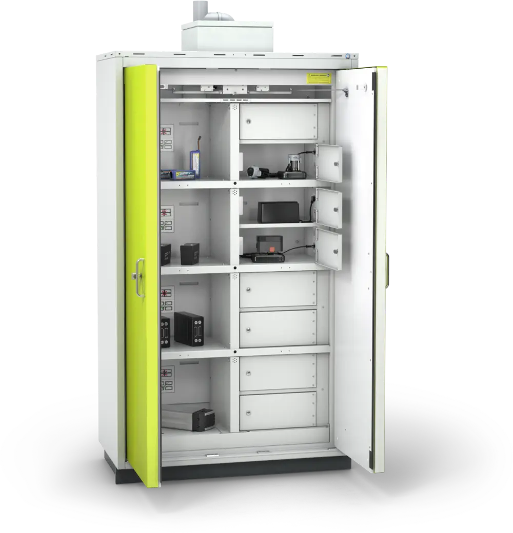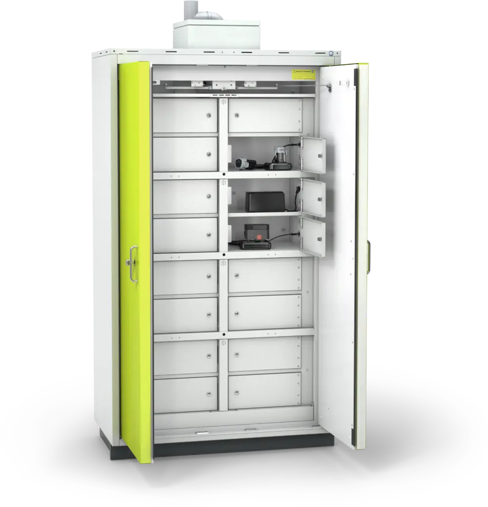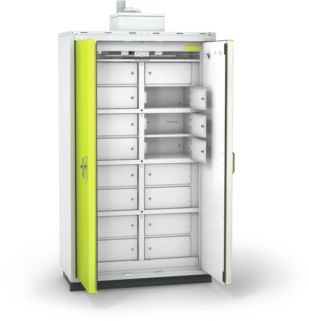Die Sicherheitsschränke der BATTERY line sind speziell zur sicheren Lagerung und zum Laden von Lithium-Ionen-Batterien konstruiert. Mit der Klassifizierung Typ 90 und dem vom unabhängigen Fraunhofer Institut geprüften explosionsartigen Abbrennen der Batterien im Innenraum, bietet die BATTERY line 2-fachen Brandschutz. Alle sicherheitsrelevanten Bauteile sind nicht der täglichen dynamischen Belastung ausgesetzt und somit frei von Abnutzung bzw. mechanischem Verschleiß.