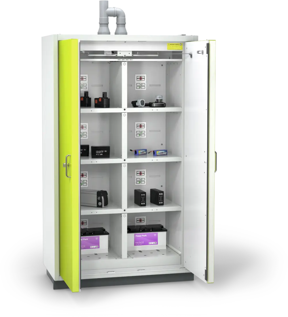 Die Sicherheitsschränke der BATTERY line sind speziell zur sicheren Lagerung und zum Laden von Lithium-Ionen-Batterien konstruiert. Mit der Klassifizierung Typ 90 und dem vom unabhängigen Fraunhofer Institut geprüften explosionsartigen Abbrennen der Batterien im Innenraum, bietet die BATTERY line 2-fachen Brandschutz. Alle sicherheitsrelevanten Bauteile sind nicht der täglichen dynamischen Belastung ausgesetzt und somit frei von Abnutzung bzw. mechanischem Verschleiß.