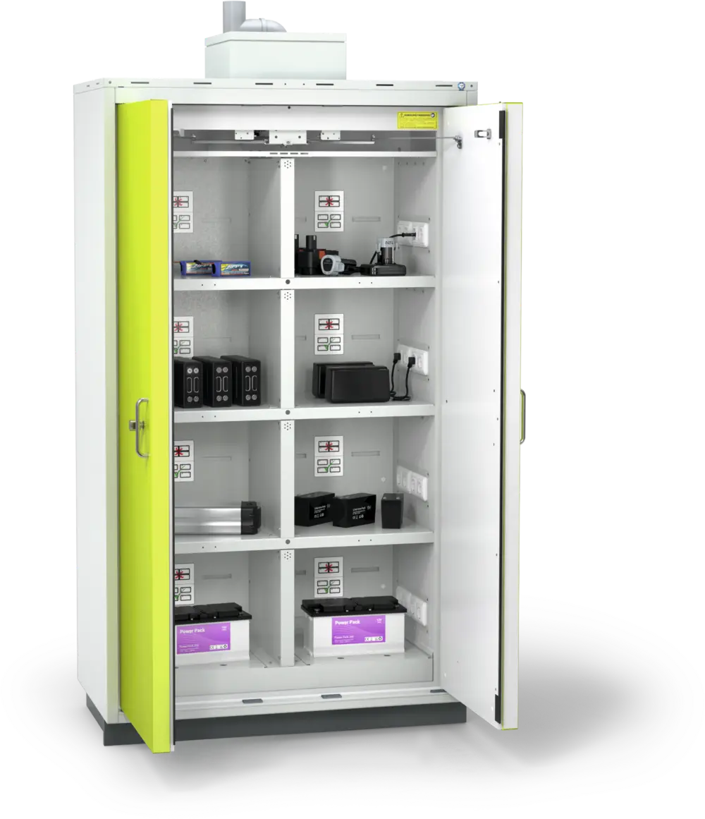 Im Brandfall im Schrankinnenraum erfolgt eine automatische Schließung und Verriegelung der Türen zur Verhinderung eines Backdrafts (Rauchgasexplosion). - Sichere Ladevorgänge