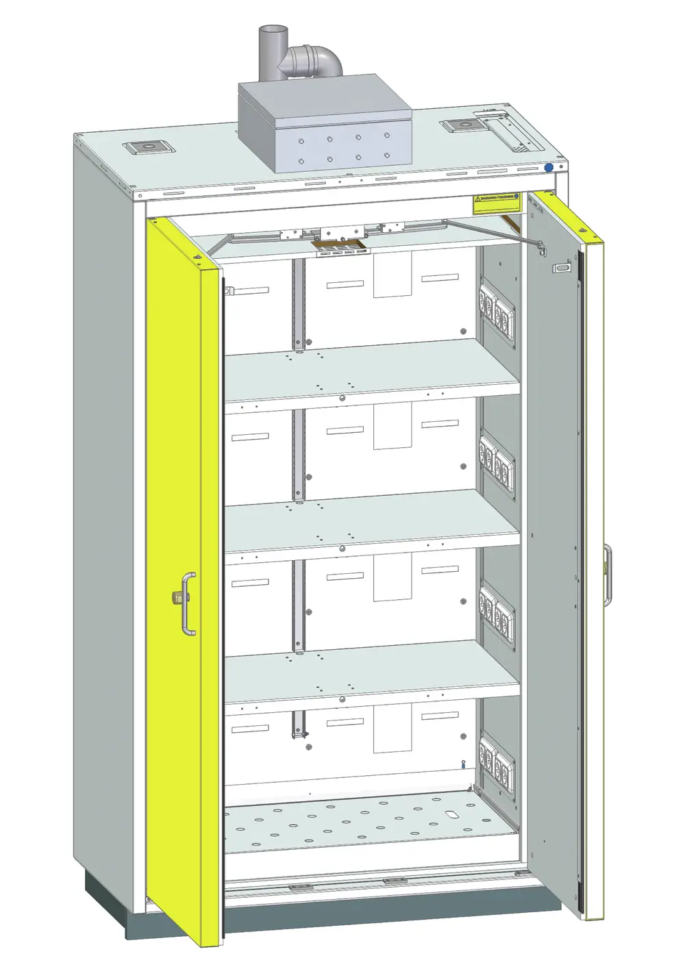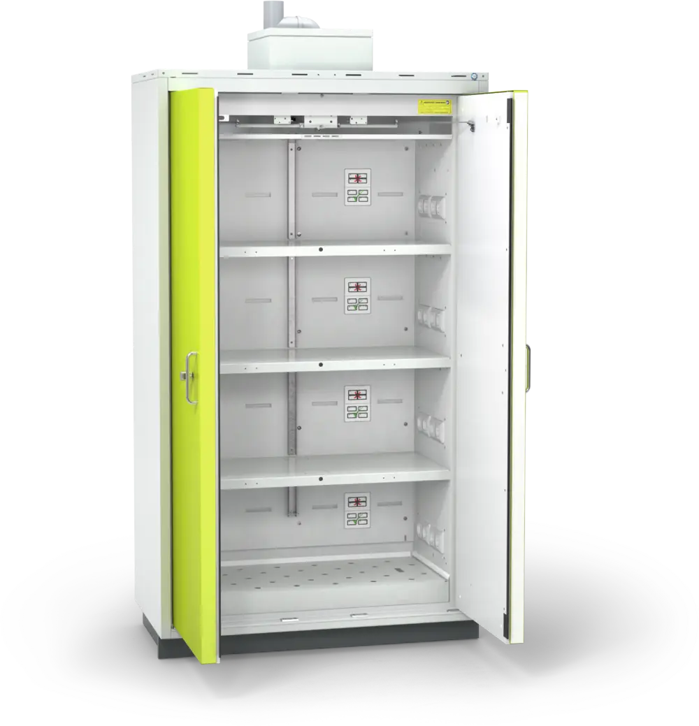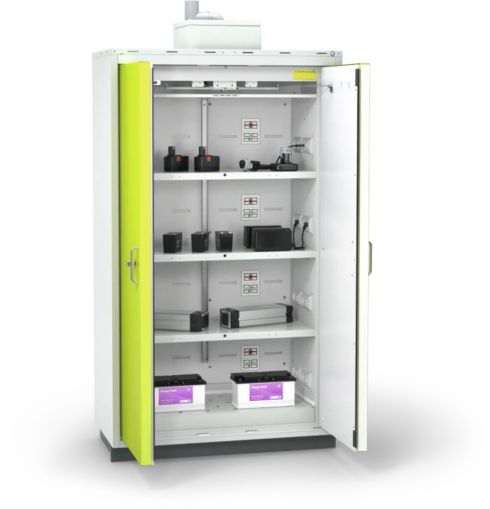 Im Brandfall im Schrankinnenraum erfolgt eine automatische Schließung und Verriegelung der Türen zur Verhinderung eines Backdrafts (Rauchgasexplosion). - Sichere Ladevorgänge
