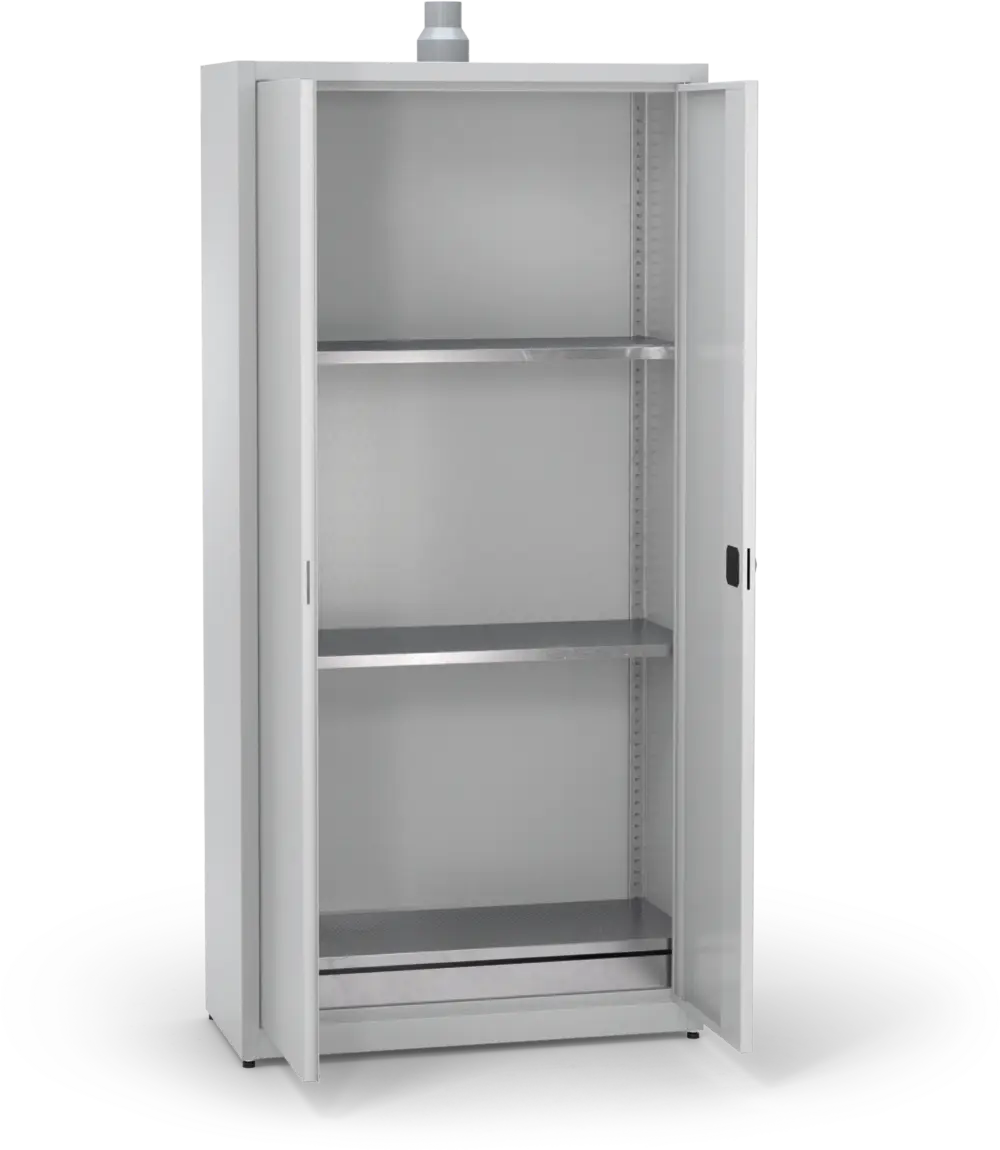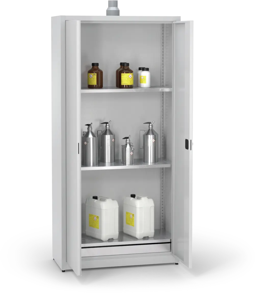 Zur sicheren und vorschriftengerechten Lagerung nicht brennbarer, wassergefährdender Gefahrstoffe WGK 1-3 in Kleingebinden. Dieses Produkt entspricht den Anforderungen des deutschen Geräte- und Produktsicherheitsgesetzes. Die Auffangwannen sind gemäß Wasserhaushaltsgesetz (WHG) von einem Fachbetrieb hergestellt.