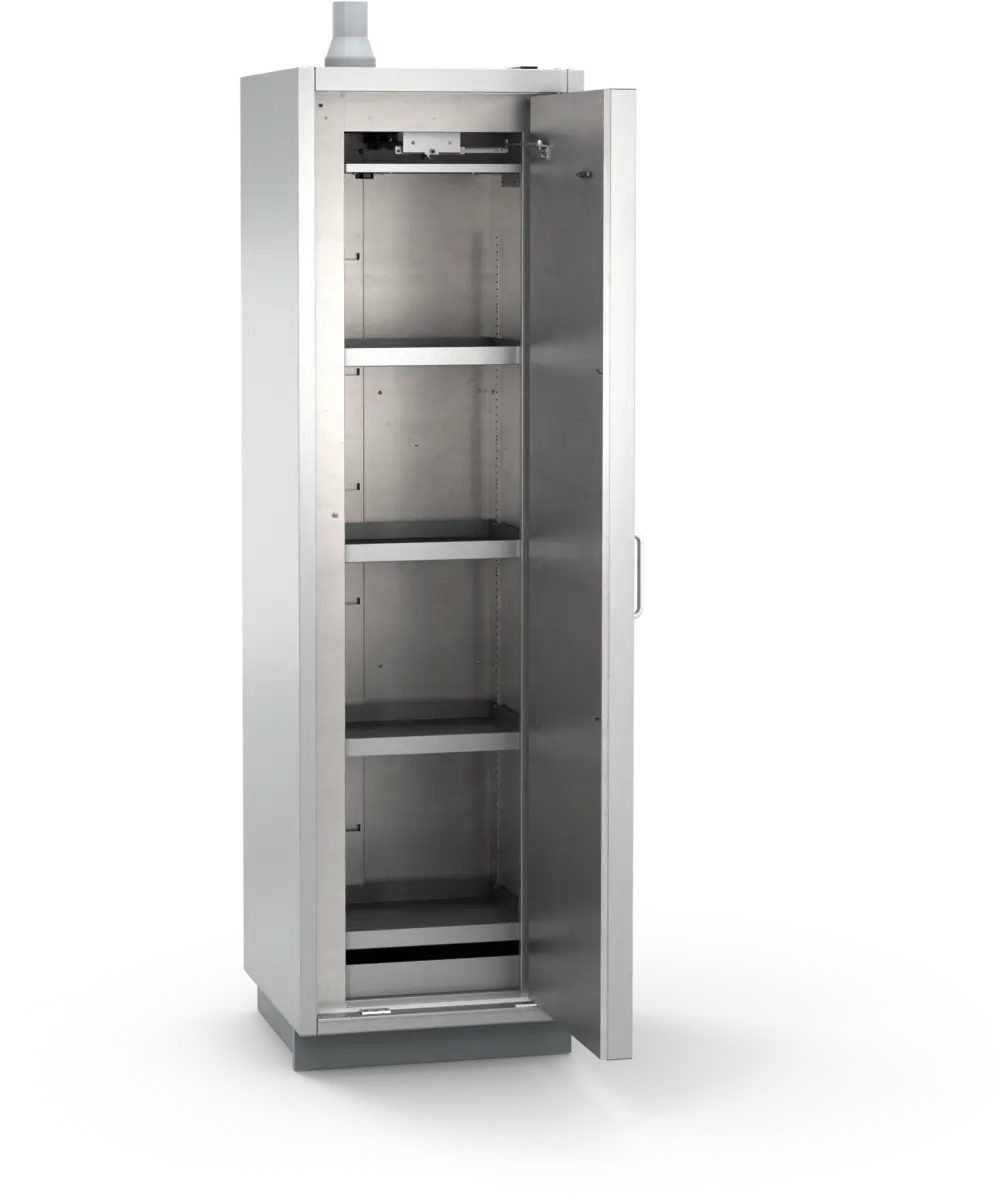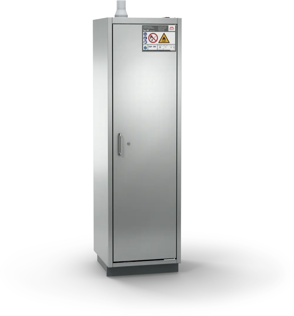 Sicherheitsschrank mit Flügeltür zur Lagerung von Gefahrstoffen in Reinräumen und Arbeitsräumen gemäß TRGS 510. Zur Aufstellung in Reinräumen geeignet.
