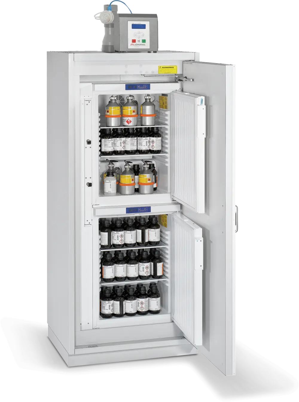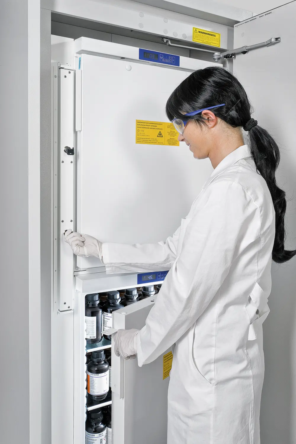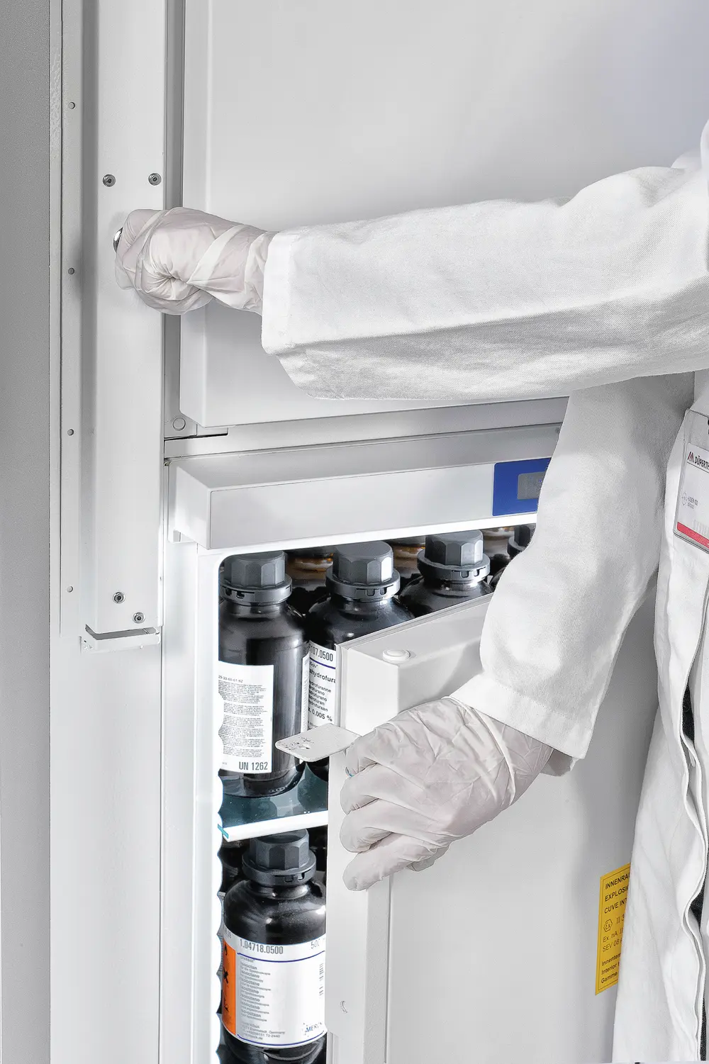 Brennbarer Flüssigkeiten werden mit der COOL line gekühlt und sicher gelagert. Unterschiedlichen Temperaturanforderungen bei brennbaren Flüssigkeiten können problemlos im COOL dual gelagert werden. Die Temperatur lässt sich hier für jeden der beiden Kühlräume separat zwischen +3 °C und +16 °C regeln.