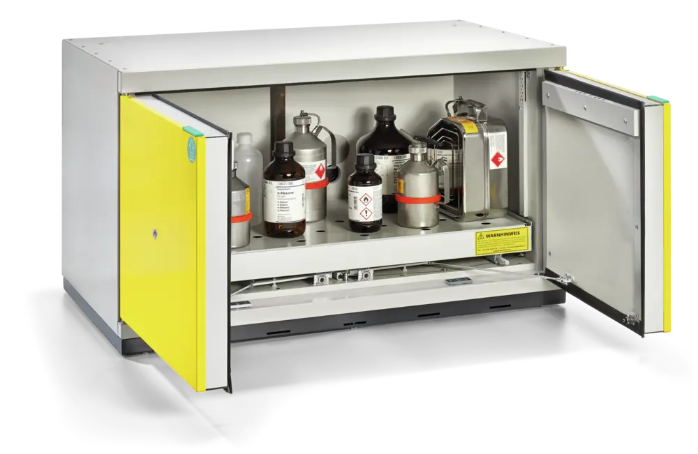 Die Sicherheitsschränke der UTS line sind die Lösung für feuergeschützte Lagerung von brennbaren Flüssigkeiten direkt am Einsatzort – unter der Arbeitsfläche. Stellen Sie sich aus den unterschiedlichen Größen und vielseitigen Zusatzoptionen die für Sie passende Lösung für Ihre Lagersituation zusammen.